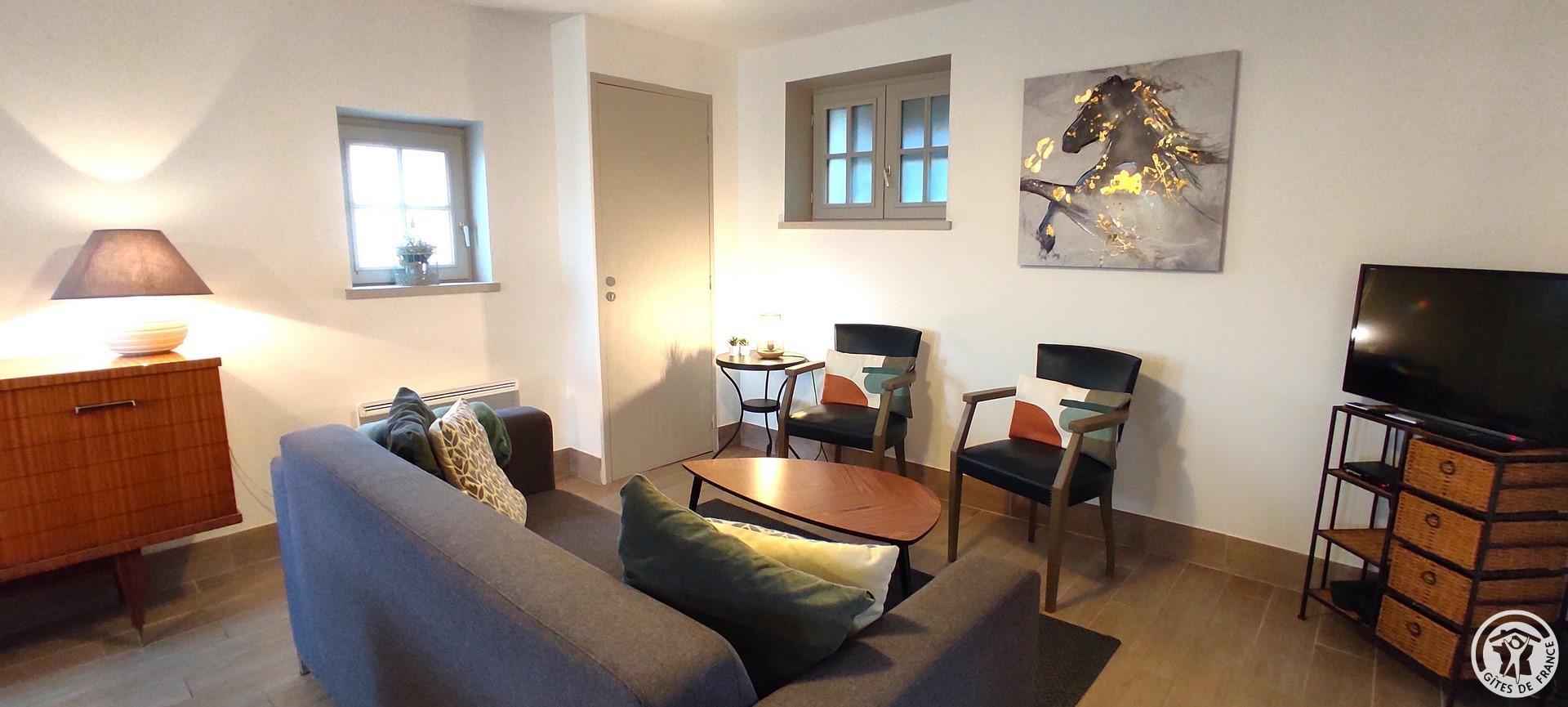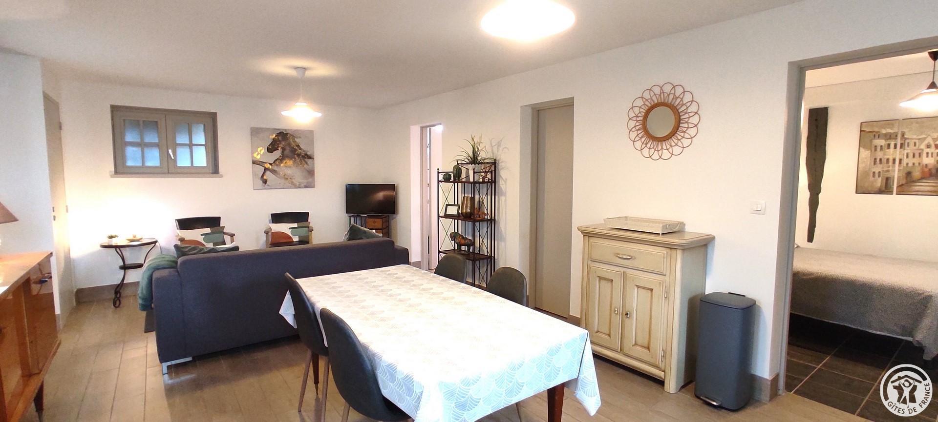 Independent gîte of character, on 2 levels. Living room with sofa bed. Upstairs: 2 bedrooms (1 double bed - 1 double bed and 2 single beds). 2 televisions (TNT, Canal Satellite). DVD player.
