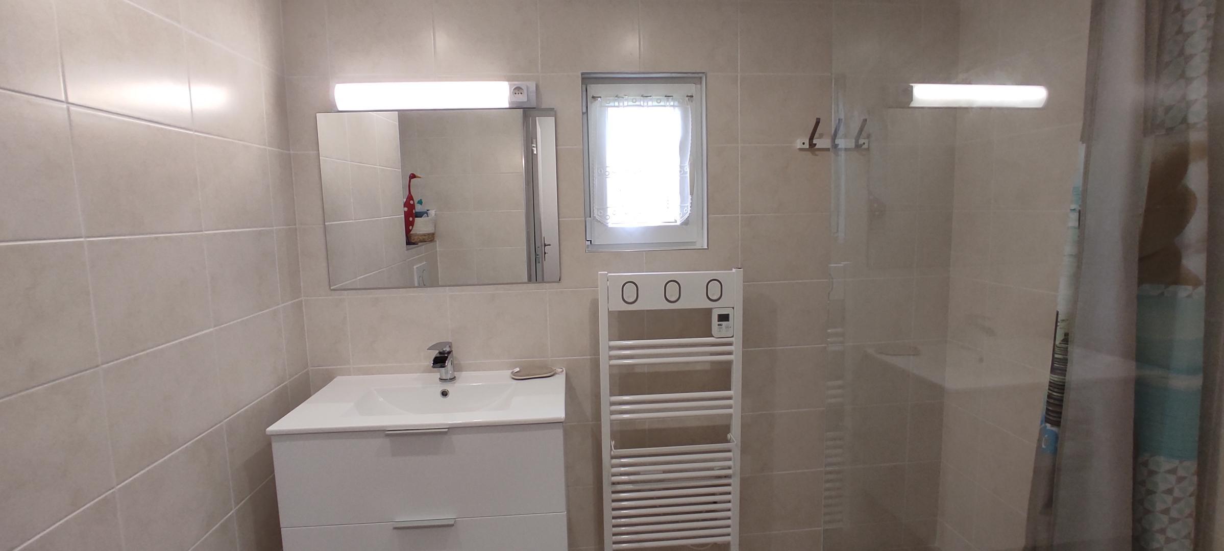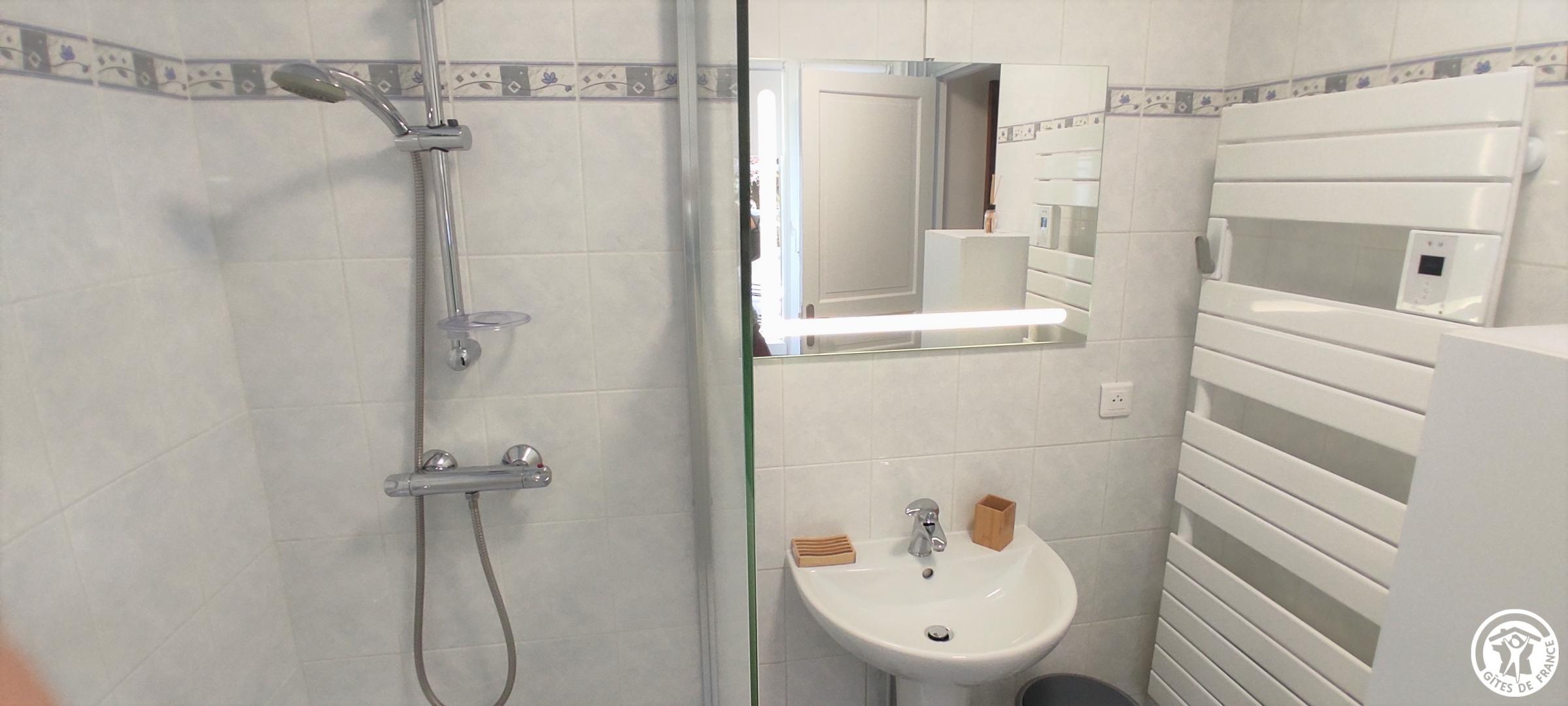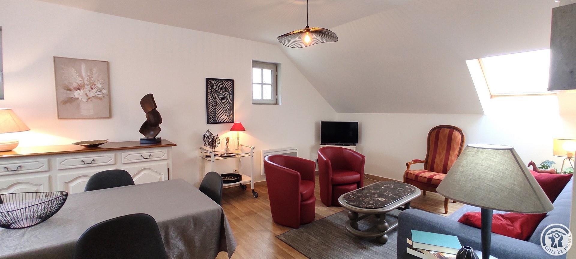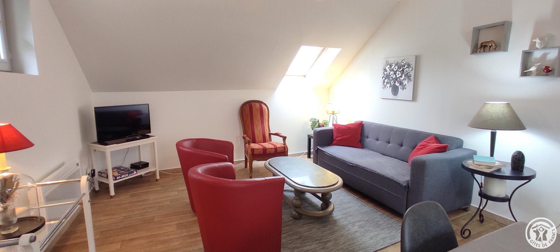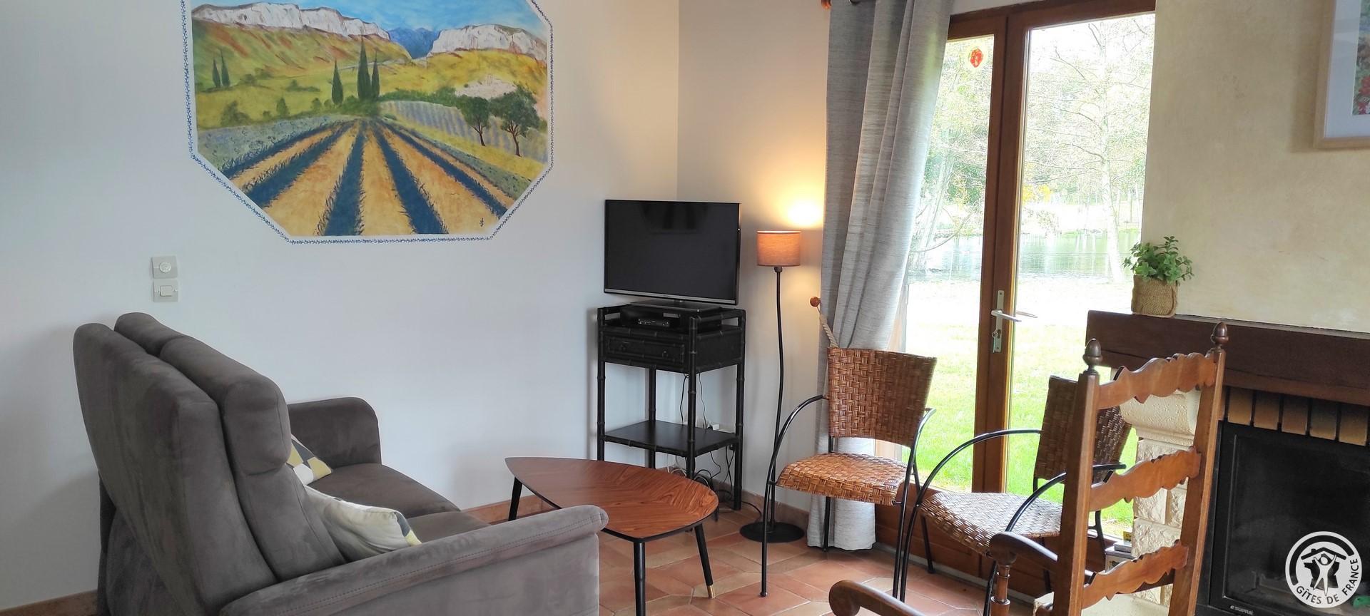 Ce gîte est aménagée en rez-de-chaussée, vous entrez dans la pièce de vie composée d'un salon ouvert sur la cuisine équipée avec coin repas.